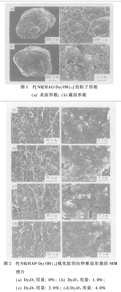 2. P[NR/HAF-Dy(OH)3]粒子表面形貌的SEM分析表明,一顆宏觀粒子是由次級粒子堆積而成,而次級粒子則由初級粒子粘結而成;炭黑粒子在NR基體中有良好的分散性,無游離炭黑存在,故產(chǎn)物無接觸污染性。