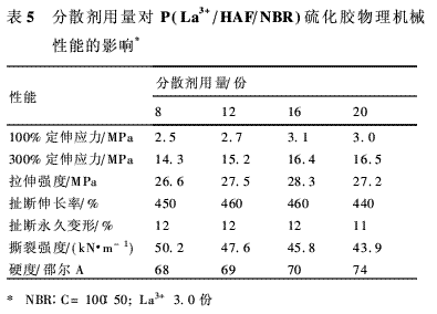2.2.3 分散劑用量對P(La3+/HAF/NBR)硫化膠物理機械性能的影響