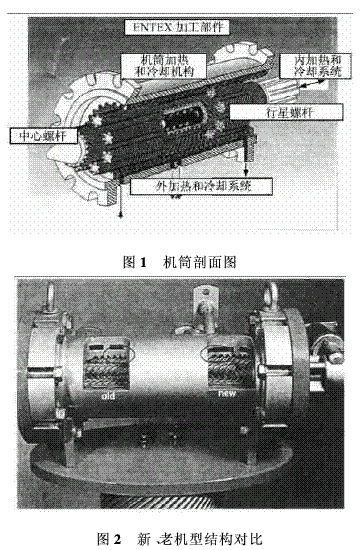 行星式螺桿擠出機(jī)現(xiàn)在主要用于涂料、熱塑性塑料及化工產(chǎn)品的混合,用于醫(yī)藥和食品行業(yè)。行星式螺桿擠出機(jī)(圖1)的加工部分主要由中心旋轉(zhuǎn)螺桿、機(jī)筒和沿圓周分布的行星式螺桿組成。中心旋轉(zhuǎn)螺桿和機(jī)筒的溫度可以控制,在溫度可控的加料段加入計(jì)量好的原材料。由中心旋轉(zhuǎn)螺桿驅(qū)動(dòng),并將扭矩依次分配給行星式螺桿。行星式螺桿沿帶有45°螺紋的機(jī)筒滾動(dòng)。由于行星系統(tǒng)采用的是螺旋嚙合方式,膠料可以向外旋出,并在旋轉(zhuǎn)部分的出口處同時(shí)排料,這樣就確保了混煉擠出機(jī)具有最佳的自清潔功能。如果采用開(kāi)放式停止環(huán),除少量殘余膠料外,幾乎所有膠料都從旋轉(zhuǎn)部分旋出,這能帶來(lái)諸多便利,例如,可以方便地更換不同顏色的膠料。由于機(jī)筒和中心螺桿機(jī)構(gòu)的壁極薄(圖2),所以對(duì)接觸面上的溫度可以進(jìn)行精確控制。再加上高壓水加熱,并改進(jìn)了冷卻通道的結(jié)構(gòu),能精確地控制溫度,從而對(duì)熱傳遞產(chǎn)生決定性的影響。因此,該系統(tǒng)愈來(lái)愈受到人們的認(rèn)可。