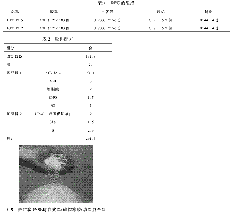 采用兩種E-SBR/白炭黑/硅烷RFC。RFC中還含有4份鋅皂作為混煉過(guò)程中的加工助劑。鋅皂能降低膠料的門(mén)尼粘度。RFC粒子的粒徑范圍為0.5 mm~1.5 mm(圖5)。RFC的組成及研究用的膠料配方分別示于表1和表2。