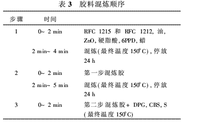RFC對(duì)比膠料在帶有嚙合轉(zhuǎn)子的1.5 L實(shí)室密煉機(jī)中混煉,加料順序見(jiàn)表3。