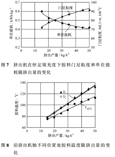 圖7示出了擠出機(jī)在填充程度恒定的情況下單位能耗和門(mén)尼粘度隨產(chǎn)量的變化情況。由圖可見(jiàn),隨擠出量的增加,單位能耗下降,門(mén)尼粘度升高。這是因?yàn)閿D出量增加后,為了將15 kg/h產(chǎn)量的恒定填充度70 L/min調(diào)高到140 L/min,可提高旋轉(zhuǎn)速度。旋轉(zhuǎn)速度提高,膠料的溫度上升,從而降低了膠料粘度和剪切應(yīng)力。圖8示出了各段機(jī)筒處的可調(diào)節(jié)膠料溫度以及出口處膠料溫度隨產(chǎn)量的變化情況。當(dāng)產(chǎn)量為15 kg/h時(shí),測(cè)得的出口處的恒定溫度為75°C。如果擠出量提高,膠料溫度會(huì)線性升高。在機(jī)筒1和機(jī)筒2處測(cè)得的溫度相同。在機(jī)筒3的出口處測(cè)得的溫度較低。當(dāng)擠出量為40kg/h時(shí),膠料溫度達(dá)到最高許可溫度(120°C)。