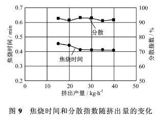 表7中列出了采用間歇式和連續(xù)式方法混煉的白炭黑填充膠料的能耗、交聯(lián)密度(S’max-S’min)及硫化膠性能(如拉伸強(qiáng)度、拉斷伸長(zhǎng)率和硬度)的比較。與間歇式混煉方法相比,用行星式螺桿擠出機(jī)連續(xù)混煉能耗降低65%,混煉制得的膠料經(jīng)硫化后的性能,如拉伸強(qiáng)度和硬度與間歇法的相同。擠出量?jī)H對(duì)填料分散和焦燒時(shí)間有輕微影響(圖9)。連續(xù)混煉膠料的性能值與間歇法混煉膠料的相當(dāng)。在整個(gè)擠出量范圍內(nèi)焦燒時(shí)間和交聯(lián)密度(S’max-S’min)都沒(méi)有變化,這證明在喂料段將交聯(lián)劑與其他組分一同加入是可行的,這是因?yàn)樾行锹輻U擠出機(jī)具有很強(qiáng)的冷卻能力。