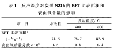 氣相法[2~6]是一種比較傳統(tǒng)的炭黑氧化改性方法,其氧化劑主要為氧氣、氧氣加氮氧化物、二氧化碳和臭氧等。工藝過程是先在密閉條件下通入惰性氣體(如氦氣、氮氣等),然后升溫至反應溫度(一般為200~700℃),再通入氣體氧化劑;反應完成后,通入惰性氣體,冷卻至室溫。一般來說,隨著反應溫度的升高和反應時間的延長,炭黑表面的酸和氧含量增大,即pH值減小、含氧基團增多、親水性增強,比表面積增大,分散性提高。但也有試驗結(jié)果與之相差較大的報道。SosaR C等[7]分別在400和600℃下氧化改性炭黑N326,工藝過程為:將炭黑放入反應管中,先在通氦氣的條件下于1 h內(nèi)升溫至100℃,然后升溫至反應溫度,通氧氣反應1 h,切斷氧氣,再通氦氣,冷卻至室溫。反應溫度對炭黑BET比表面積和表面氧含量的影響見表1。從表1可以看出,改性后炭黑的BET比表面積增大,但表面氧含量減小,且反應溫度越高,炭黑的BET比表面積越大,表面氧含量越小。分析認為,在氧化反應初始階段,隨著氧化時間的延長,炭黑表面氧含量可能增大,但反應進行到一定程度,炭黑表面的苯羧酸和酚羥基分解,生成一氧化碳和二氧化碳,因此高溫過度氧化不但不會增加炭黑表面的含氧基團,反而會降低其氧含量。