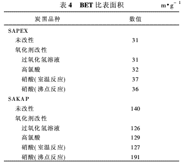 Choma J等[13]研究了氧化改性后炭黑比表面積的變化。試驗所用的氧化劑是質(zhì)量分數(shù)分別為0·3,0·3和0·65的過氧化氫溶液、高氯酸和硝酸;炭黑為熔融炭黑SAPEX和SAKAP。試驗步驟是:將100 mL氧化劑和10 g炭黑加入燒杯中,室溫反應3 h,反應完畢后過濾,用去離子水清洗炭黑,直到洗液的pH值恒定;將炭黑在110℃下烘5 h。另外,再取100 mL質(zhì)量分數(shù)0·65的硝酸和10 g炭黑在硝酸的沸點溫度下反應3 h,反應完畢冷卻至室溫,重復上述洗滌、干燥過程。改性炭黑的BET比表面積見表4。從表4可以看出,氧化劑品種和反應溫度對改性炭黑BET比表面積的影響較大。