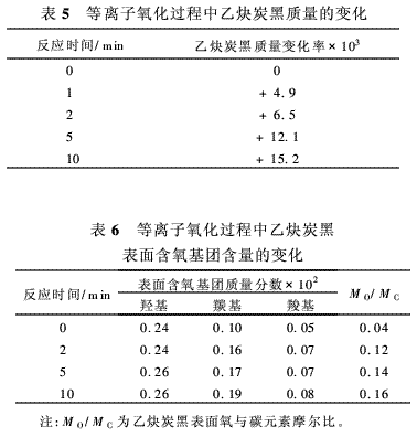 Xu Li等[16]采用氧氣等離子體對炭黑進行改性。試驗條件為:乙炔炭黑用量 100 mg,等離子體 射頻(RF)等離子體,氧氣壓力 200 MPa,輸入功率 15 W,輸入頻率 13.56 MHz。試驗結(jié)果見表5和6。