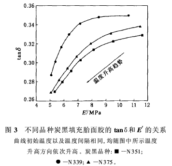 (2)炭黑N339填充胎面膠的粘性較大,其滯后損失也較為嚴重。在同樣的E′下,3種炭黑填充的胎面膠在低溫時tanδ值的變化均小于高溫時的變化。