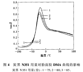 (3)炭黑N351填充胎面膠的tanδ峰值隨其用量的增大而降低,其位置也隨炭黑N351用量的增大而向低溫方向移動。