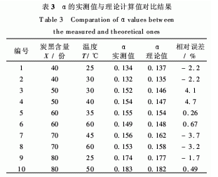將表2中的A、B與炭黑填充量的關系數(shù)據(jù)用最小二乘法進行回歸分析,得出2個方程式:A=0·106 12+9·672 29×10-4X (2)B=-3·741 22×10-4+1·689 67×10-6X(3)將式(2)、式(3)帶入式(1)中,即得熱擴散系數(shù)α與溫度T和炭黑N220填充量X的關聯(lián)式:α=0·106 12+9·672 29×10-4X+(-3·741 22×10-4+1·689 67×10-6X)T(4)在測試溫度和炭黑填充量的范圍內(nèi)隨意抽取10組數(shù)據(jù),與采用公式(4)計算的理論值相比較,結果見表3。