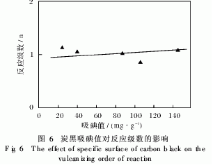 2. 2. 1 對反應(yīng)級數(shù)n影響 如圖6所示,炭黑的吸碘值對EPDM硫化反應(yīng)級數(shù)n也沒有影響。這種結(jié)果同填充量影響的分析是一致的。