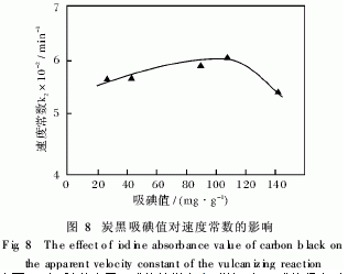 由圖8可知,隨著炭黑吸碘值的增大,k2增加;但吸碘值很大時,k2又有所減小。這是因為隨炭黑吸碘值增大,同橡膠相互作用機會增多,吸附的橡膠就增加,相應(yīng)提高了硫化劑的濃度,加快了硫化速度;但吸碘值很大時,由于炭黑彼此之間相互作用太大,難于分散,影響硫化劑的均勻分散,使k2下降。