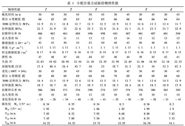 小配合基本配方:NR 70; BR 30;硬脂酸2;防老劑 3; S+促進(jìn)劑 2·7;炭黑 45;合計(jì)152. 7。1#~3#使用4份、3份、2份的間接氧化鋅; 4#~6#使用4份、3份、2份的濕法氧化鋅,其它原材料相同。