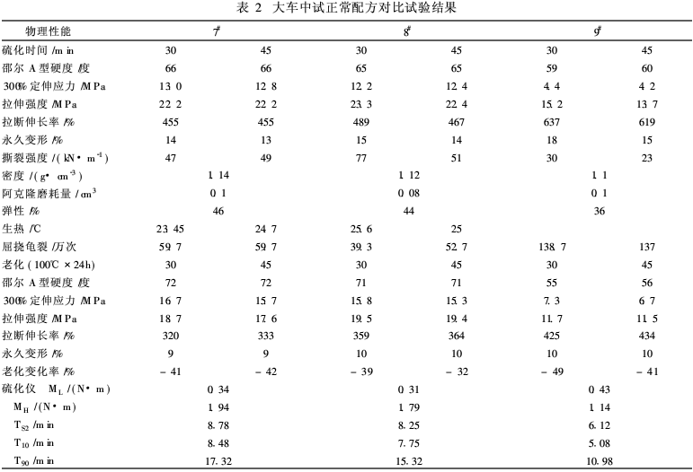 大車(chē)中試在F370上進(jìn)行,試驗(yàn)?zāi)z料為正?;九浞?在嚴(yán)格的相同條件下進(jìn)行對(duì)比試驗(yàn),試驗(yàn)配方與結(jié)果見(jiàn)表2。