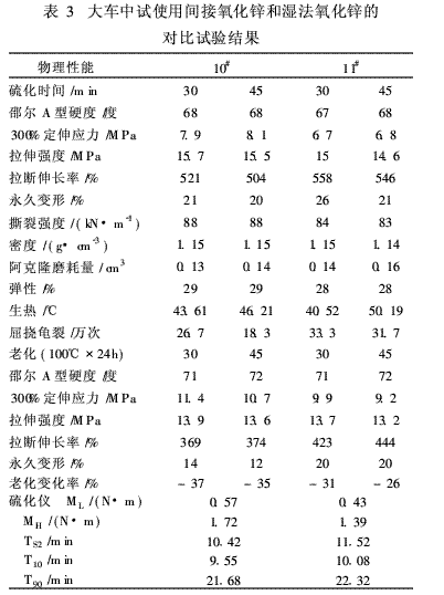 在生產(chǎn)配方中分別使用3·4份間接氧化鋅和濕法氧化鋅進(jìn)行對(duì)比,從物理性能來(lái)看, 300%定伸應(yīng)力間接氧化鋅稍好于濕法氧化鋅。拉伸強(qiáng)度:間接氧化鋅稍好于濕法氧化鋅。磨耗性能:間接氧化鋅稍好于濕法氧化鋅。壓縮生熱性能相差不大,屈撓性能濕法氧化鋅稍好于間接氧化鋅。硫化速度間接氧化鋅稍快于濕法氧化鋅。