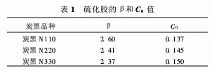 從表1可以看出,炭黑N110補強硫化膠的β值最大,C0值最小,說明炭黑N110補強硫化膠的潛在缺陷最小,但裂紋擴展速度最快;炭黑N330補強硫化膠的β值最小,C0值最大,說明炭黑N330補強硫化膠裂紋擴展速度最慢,但潛在缺陷最大;炭黑N220補強硫化膠的β值和C0值居中,說明炭黑N220補強硫化膠的潛在缺陷和裂紋擴展速度居中。