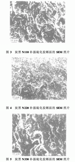從圖3~5可以看出,炭黑N110補強硫化膠的斷面較平整、光滑,孔洞最小,呈脆性斷裂形貌,說明炭黑N110補強硫化膠的潛在缺陷最小,但裂紋擴展速度快;炭黑N220補強硫化膠的斷面裂紋清晰,孔洞較大,說明炭黑N220補強硫化膠的潛在缺陷較大;炭黑N330補強硫化膠的斷面凹凸不平,孔洞最大,呈延展性破壞形貌,說明炭黑N330補強硫化膠的裂紋擴展速度慢,但潛在缺陷最大。該結(jié)論與前面的結(jié)論吻合。