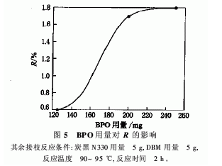 單體DBM用量對R的影響如圖4所示。從圖4可以看出,隨著DBM用量的增大,R增大;DBM用量超過5 g后,R變化趨緩,其原因可能是炭黑表面上能被引發(fā)劑激活的活性點已較少,