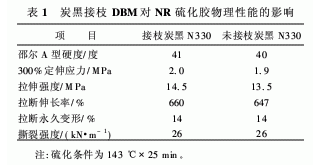 炭黑表面固相接枝DBM的優(yōu)化反應條件為:DBM/炭黑N330質量比 1∶1,BPO/炭黑N330質量比 0.04∶1,反應溫度 90~95℃,反應時間 1 h。炭黑接枝DBM可提高NR硫化膠的定伸應力、拉伸強度和拉斷伸長率。