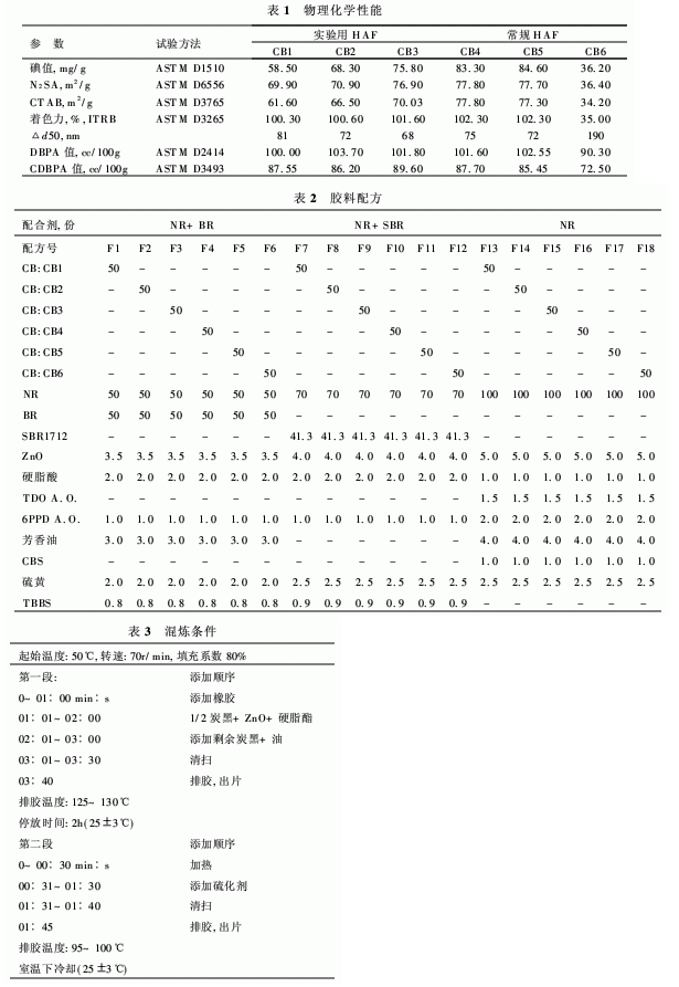 為了對胎體炭黑膠料進(jìn)行評估,所有的HAF炭黑(CB1~CB2)及N660(CB6)均考慮了如下性能。
