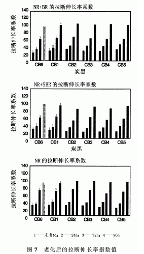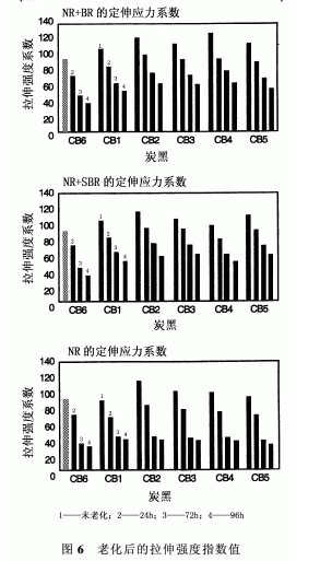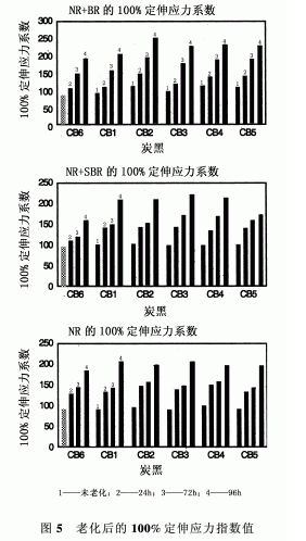 考慮到胎體膠料使用壽命期內(nèi)的多種苛刻性和可翻新性,老化試驗在不同試驗溫度下(如70℃)進(jìn)行24h、72h和96h。測定了諸如100%定伸應(yīng)力、拉伸強度和拉斷伸長率等性能。胎體膠料的老化性能非常重要,因為這將表明可翻新的程度和在延長的使用壽命期內(nèi)破壞的程度。為了便于對老化性能理解和比較,將絕對值轉(zhuǎn)化成了一個指標(biāo),取各個N660(CB6)膠料中未老化前的值為100。