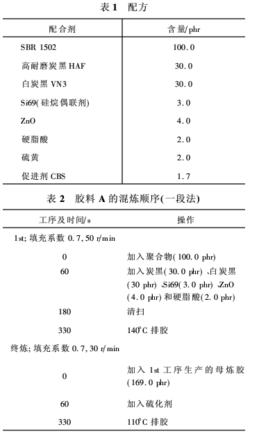 以下將就白炭黑填充膠料探討三種不同順序的混煉工藝(Y法、一段法和多段法),并將硫化前(門尼粘度值和硫化時(shí)間)和硫化后(100%定伸應(yīng)力、200%定伸應(yīng)力和300%定伸應(yīng)力、拉斷強(qiáng)度、拉斷伸長率、硬度和粘彈性)的橡膠性能作了對(duì)比。從膠料性能和生產(chǎn)效率角度討論了用Y法混煉代替普通混煉工藝的前景。
