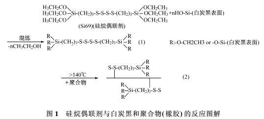 膠料A和C分別表現(xiàn)出最低和最高的ML1+4值。這些結(jié)果可以用硅烷偶聯(lián)劑和白炭黑對(duì)膠料的影響來解釋,它們的反應(yīng)見圖1。