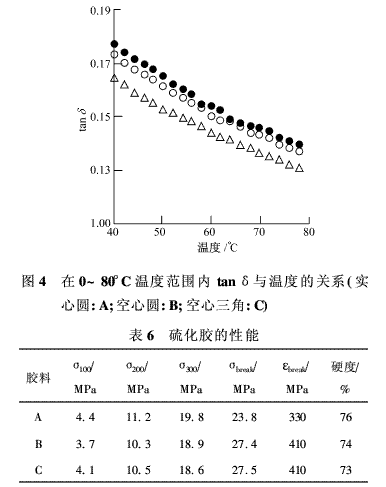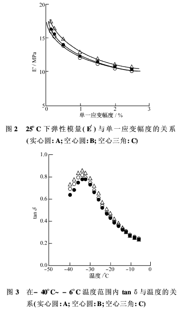 tanδ值被用作衡量膠料在動(dòng)態(tài)變形作用下能量損失的一個(gè)指數(shù)。輪胎的滾動(dòng)阻力和抗?jié)窕阅芊謩e根據(jù)高(>40°C)、低(< 0°C)溫時(shí)的tanδ值,通過實(shí)驗(yàn)來評(píng)價(jià)。圖3和圖4為在高、低溫范圍內(nèi)3種不同膠料的tanδ值與溫度的關(guān)系。在低溫范圍內(nèi)(約-10°C~0°C),tanδ值在3種膠料之間并未出現(xiàn)出任何明顯的差異,表明抗?jié)窕阅軒缀醪皇芑鞜掜樞虻挠绊?而在高溫范圍內(nèi)(約50°C~70°C),tanδ值則顯示出明顯依賴于混煉工藝條件的傾向,因此,它是按照A>B>C的次序逐漸減小。對(duì)于B和C,白炭黑的效果比A有所提高(白炭黑有望改善滾動(dòng)阻力且不致惡化抗?jié)窕阅?。雖然分子量對(duì)E′和tanδ都有影響,但與聚集的作用相比,這種影響并不重要。