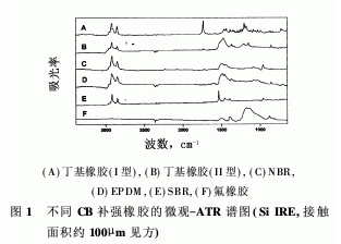 圖1是6種不同CB補(bǔ)強(qiáng)橡膠的微觀-ATR譜圖。譜圖沒有對ATR實驗的波長依賴性進(jìn)行修正,所以,在3000cm-1附近的C-H伸縮振動峰的強(qiáng)度比吸收光譜弱。很顯然,該光譜可以區(qū)別不同材料,包括無機(jī)部分和有機(jī)部分。例如,譜圖B、C、D,分別對應(yīng)丁基橡膠(II型),NBR和EPDM試樣,都顯示了碳酸鹽填料1460cm-1附近的寬峰和856cm-1附近的尖峰。盡管受填料影響,丁基橡膠(I型)的譜圖A沒有顯示吸收,但是有助劑或交聯(lián)劑的吸收峰,包括1740cm-1附近強(qiáng)的C=O伸縮振動峰。由于NBR的譜圖C中丙烯腈基團(tuán)在2235cm-1附近的吸收峰非常弱,所以沒有提到。