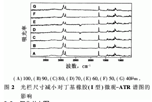 圖1的譜圖是采用ATR附件,沒有使用光欄條件下的最大信號。如果要成功的應(yīng)用ATR技術(shù),如測試氧化分布圖,在一定情況下就必須提高空間分辨率。圖2是丁基橡膠(I型)的微觀-ATR譜圖,光欄尺寸從100μm見方減小到40μm見方。隨光欄尺寸的減小,譜圖的噪音增加。但是,光欄尺寸在100~50μm之間,幾乎沒有損失任何譜圖信息。光欄尺寸為40μm時,譜圖信息有所損失,尤其是1000~700cm-1區(qū)域的信息損失。通過延長測試時間可以提高信噪比。如果光欄尺寸小于40μm,信噪比非常弱,以至于測試時間必須很長。所以,實際最小光欄尺寸為40μm。