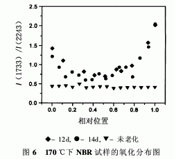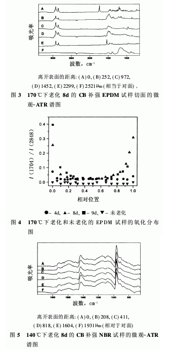 圖5是140℃下老化8d的CB補(bǔ)強(qiáng)NBR試樣的典型譜圖。觀察到靠近試樣暴露表面的譜圖中1730cm-1附近增強(qiáng)的C=O吸收峰。圖6老化12d和14d的NBR試樣的氧化分布圖(只是為了對比,不能作為動力學(xué)研究的重要數(shù)據(jù)),二者之間區(qū)別不大。未老化的NBR試樣的等效數(shù)據(jù)也見圖6。值得注意的是,未老化的NBR試樣的譜圖與未老化的EPDM試樣譜圖不同,仍然有C=O吸收峰。原因是含有助劑或其他聚合物特征的C=O存在。由圖6可見,試樣的氧化反應(yīng)顯著增加。實際上,在此實驗條件下,即使試樣的中間部分也會有一定程度的氧化。該結(jié)果與擴(kuò)散受限的氧化分布圖的經(jīng)典形狀一致。受擴(kuò)散限制的降解阻止氧化向試樣內(nèi)部發(fā)展。