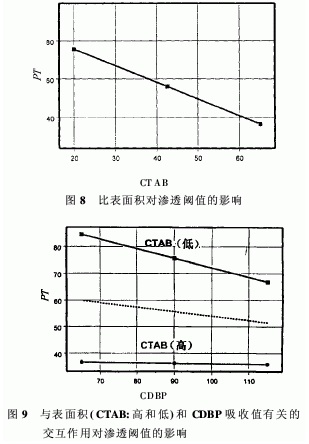 不難得出:在高比表面積下,CDBP(壓縮試樣DBP)吸收值對(duì)滲透閾值的影響可以忽略。另一方面,表面積變得越低,CDBP吸收值的影響增加得越多,因而不再可以被忽略。不過,圖7卻表明了表面積是起決定作用的參數(shù)。表面積的主要效應(yīng)是表面積每增大10m2/g,滲透閾值降低8份左右,而CDBP每增加10mml/100g,對(duì)滲透閾值的影響則僅僅只有2份而已(見圖8~9)。
