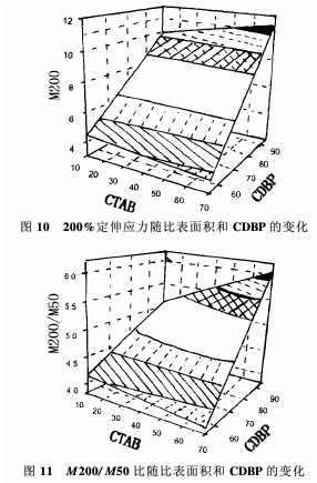 可以清楚地確認(rèn),CDBP吸收值對(duì)200%定伸應(yīng)力的影響,要比CTAB吸附值表示的比表面積的影響大得多。引人注目的是,CDBP吸收值越高,表面積的影響越大。M200/M50的比值圖再次表明了與表面積相比,CDBP的影響占據(jù)了優(yōu)勢(shì)。然而,低表面積CDBP的影響卻要比高表面積小。因此,為了獲得跟低表面積炭黑相近的補(bǔ)強(qiáng)性能,壓縮試樣結(jié)構(gòu)度的選擇必須比高表面積炭黑所需要的更高。