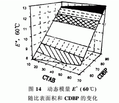 動(dòng)態(tài)剛度是填充膠料的另一個(gè)重要參數(shù)。圖14表明了在60℃下測(cè)得的動(dòng)態(tài)剛度E*隨表面積和結(jié)構(gòu)變化的情形。在這里,我們可以指出的是,起支配作用的因素是由CDBP吸收值賦予的。所以,CTAB吸附值大約為20m2/g的低表面積,將不會(huì)對(duì)動(dòng)態(tài)剛度造成消極的影響。