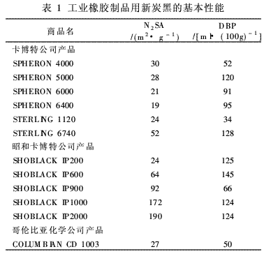 目前,已投放市場(chǎng)的工業(yè)橡膠制品用新炭黑,卡博特公司的產(chǎn)品有SPHERON 4000、SPHERON5000、SPHERON 6000、SPHERON 6400、STER-LING 1120和STERLING 6740等;昭和卡博特公司的產(chǎn)品有SHOBLACK IP200、SHOBLACKIP600、SHOBLACK IP900、SHOBLACK IP1000和SHOBLACK IP2000等;哥倫比亞化學(xué)公司的產(chǎn)品有COLUMBIAN CD 1001、COLUMBIAN CD 1003和COLUMBIAN CD 1004等。這些新炭黑的比表面積(N2SA)和吸油值(DBP)的典型值見表1。