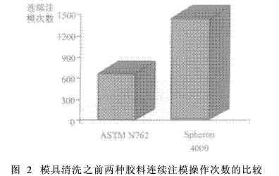 因?yàn)镾PHERON 4000炭黑的特殊形態(tài),隨著填料填充量的增加,膠料粘度只稍微有所升高,使膠料的流動(dòng)性更好。用含有SRF炭黑(N772)和混配有SPHERON 4000的兩種膠料生產(chǎn)模型制品,記下在模具需要清洗之前,這兩種膠料連續(xù)注模操作的次數(shù),測(cè)定結(jié)果示于圖2。顯然,SPHERON 4000炭黑,延遲了為清洗模具而中斷生產(chǎn)的時(shí)間。