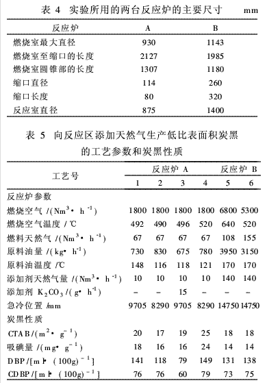 其工藝特點(diǎn)是,燃燒室中的高溫燃燒氣流是由天然氣在過量的空氣中燃燒而得。用作燃料的天然氣和燃燒用空氣從反應(yīng)爐燃燒室前端的入口1噴入。與普通的油爐法工藝不同的是,它既以液態(tài)油料為原料,又以氣態(tài)烴(如天然氣)為添加劑,從縮口的同一位置經(jīng)由噴槍2徑向注入爐中。急冷水從噴嘴3噴入,以終止反應(yīng)。實(shí)驗(yàn)采用兩臺(tái)反應(yīng)爐,其爐型結(jié)構(gòu)完全相同,而尺寸不同(如表4中的反應(yīng)爐A和反應(yīng)爐B)。它們的主要尺寸、工藝參數(shù)和炭黑的性質(zhì)見表4和表5。