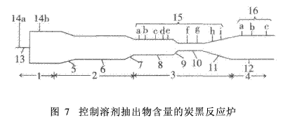 新日鐵化學(xué)采用控制溶劑抽出物含量的方式,改善炭黑在膠料中的分散性??煽刂迫軇┏槌鑫锖康奶亢诜磻?yīng)爐結(jié)構(gòu)如圖7所示。1是前燃燒段, 2是后燃燒段, 3是反應(yīng)段, 4是急冷段。反應(yīng)段3的縮口部位10的直徑為70mm,縮口后面的錐形部位11的發(fā)散角度為6°。反應(yīng)段3的爐壁上設(shè)有多處原料油注入點(diǎn)15(如圖所示,由15a至15,i共9處),急冷段設(shè)有3處急冷水入口16。甲苯抽出物(Ts)的含量可選擇合適的原料油入口到急冷點(diǎn)的停留時(shí)間來調(diào)節(jié)??s短停留時(shí)間,炭黑的Ts值則增加。至于甲苯抽出物(Ts)與吡啶抽出物(Ps)之比(Ts/Ps)是影響炭黑性能的一個(gè)參數(shù),它可用原料油入口之前的高溫燃燒氣中的殘余氧含量和原料油量之比來調(diào)節(jié)。