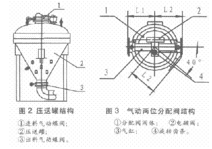 原系統(tǒng)采用的是1.5m3的壓送罐。在輸送的過程中由于容積小,輸送頻繁。此次改造選用了德國技術生產的2.5m3壓送罐,進料口采用Dn300的氣動蝶閥,出料口采用Dn200的氣動蝶閥,排氣口為Dn80的氣動蝶閥。料位計采用E+H陰差式料位計。壓送罐結構見圖2。