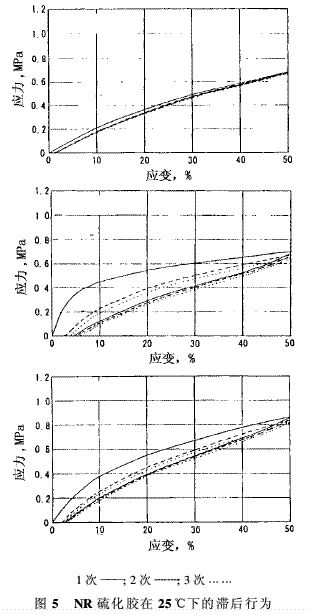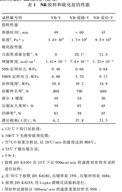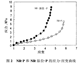用另一種更實際的方法制備了原位白炭黑填充的NR納米復合材料。用此方法在NR基質(zhì)中原位填充白炭黑后進行交聯(lián)。NR膠料和硫化膠的性能見表1。NR-原位-V顯示出獨特的性能,其中有些性能是VN-3填充NR不能達到的:與NR-混煉-V相比,在室溫下其具有低滯后損失、低壓縮永久變形、高回彈、高應(yīng)力和低貯存模量。例如,圖5示出在25℃下有與沒有白炭黑的NR硫化膠的滯后行為。這些性能對某些橡膠產(chǎn)品的應(yīng)用是有意義的。