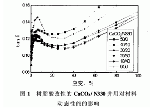 表面處理的納米碳酸鈣與炭黑并用,可以降低炭黑填充橡膠的動(dòng)態(tài)滯后;表面處理的納米碳酸鈣的加工性能比納米炭黑好,可以通過并用納米碳酸鈣來改善炭黑膠料的加工性能。二者并用比適當(dāng)時(shí),膠料的拉伸性能和成本也令人滿意。樹脂酸表面改性較脂肪酸表面改性的綜合效果好一些。