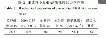 未經(jīng)MAH單體改性的NR/HAF復(fù)合材料硫化膠的力學(xué)性能測試結(jié)果見表2.