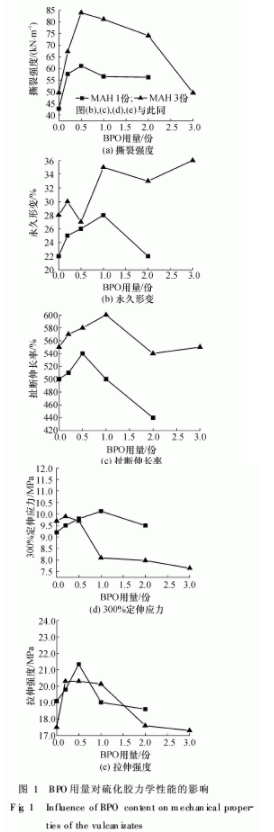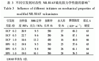 兩種引發(fā)劑BPO和DCP對于MAH改性NR/HAF復(fù)合材料硫化膠力學(xué)性能的影響的比較見表3.