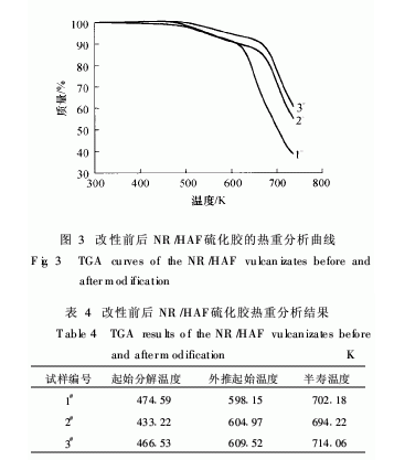 NR/HAF和MAH改性NR/HAF硫化膠的熱重(TGA)測試分析結(jié)果見圖3和表4.