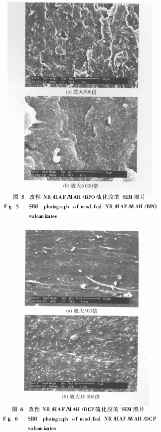 從圖5和圖6中可清晰看到經(jīng)MAH接枝改性的NR與HAF的混煉膠,炭黑的分散得到明顯改善,炭黑粒子分布均勻且相界面模糊,撕裂斷面有撥絲現(xiàn)象,斷面上因炭黑脫除留下的孔洞極少.這可能是由于MAH單體在混煉過程中的機(jī)械力和硫化過程中的熱作用下,與NR大分子上產(chǎn)生接枝共聚反應(yīng)的同時,也與HAF表面的活性基團(tuán)產(chǎn)生了化學(xué)反應(yīng),從而在硫化膠中形成“整體網(wǎng)絡(luò)效應(yīng)”,加強(qiáng)了橡膠與炭黑之間的結(jié)合效果.圖5與圖6比較可見,以DCP為引發(fā)劑時得到的混煉膠中的炭黑分布比以BPO為引發(fā)劑時更為均勻,結(jié)合更緊密,因此力學(xué)性能更好.
