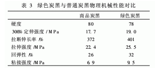從表3所列數(shù)據(jù)可以看出,對于同樣的配方,以綠色炭黑代替普通商業(yè)炭黑后,硫化膠的拉伸強度、拉斷伸長率、300%定伸應力、回彈性、與金屬粘合強度均有明顯提高,硬度略有降低。