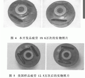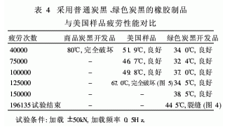 圖4和圖5是采用綠色炭黑開發(fā)的某橡膠制品與美國樣品疲勞實驗后的實物照片。可見,采用綠色炭黑的橡膠制品,最大生熱比采用普通炭黑降低約44%以上,疲勞壽命提高約5倍;與美國樣品相比,最大生熱降低33%以上,疲勞壽命提高50%以上。