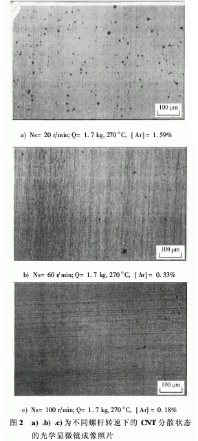 就如同在圖2中所看到的一樣,螺桿轉(zhuǎn)速[Ns]越多,每單位材料所遭受的剪切速度[r]的值越大,越有利于分散。再則,如圖2c)所示,分散率[Ar]不到0.2%,具有良好分散的樣品,也可以通過TEM證實。從圖3可以看到CNT的凝聚態(tài)瓦解成一次結(jié)構(gòu),也可以看到在膠料中細微分散的情況。