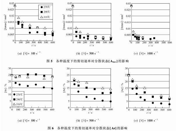 圖5是在各種剪切速度下按不同溫度進行比較的[Amax]值。剪切速度越大,剪切過程時間越長,越有利于分散進行。另外,剪切速度越大,不同溫度下的分散狀態(tài)之間的差異就越小。并且,就像在圖5(b)中270°C下的圖形所看到的那樣,即使在比較小的剪切速率下,在初期階段的20 s左右時,[Amax]值的減少就已經(jīng)達到了飽和,所以,可以推斷,圖1過程中的(1)、(2)之凝聚破壞只是發(fā)生在很短的時間內(nèi)。同樣,即使增大剪切速率,破壞凝聚的速度也不會有多大提高,顯然,降低成型溫度,在短時間里進行分散是有效果的。
