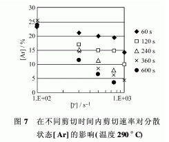 圖6顯示了剪切速率從100 s-1300 s-1500 s-1逐步增大時,不同溫度下的分散率[Ar]。在剪切速率[.r]=100 s-1時,可以和圖6(a)中的最大粒子面積[Amax]和分散率[Ar]的性質(zhì)進行比較。顯然,在各種溫度下,[Amax]的值在起初的240 s左右之內(nèi),隨著剪切時間的增加粒子不斷變小。但是,在300 s以后的時間里,凝聚破壞就變得遲緩了。另一方面,[Ar]值即使經(jīng)過較長時間也不會變小,所以,在[r]=100 s左右的低剪切范圍內(nèi),即使能夠把大的凝聚體分散到某種小的尺寸,也還不能達到微分散的程度。