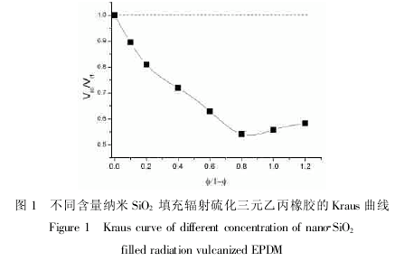 橡膠網(wǎng)絡分子鏈與填料粒子之間的相互作用主要來自兩方面[4~6]:一是在填料表面與高聚物分子之間產(chǎn)生的物理結(jié)合,如范德華力、物理纏結(jié)等;另一方面則是兩者之間直接產(chǎn)生的化學吸附作用。本文將從Kraus方程、紅外光譜分析和交聯(lián)密度等角度來討論納米二氧化硅與三元乙丙橡膠間的相互作用。